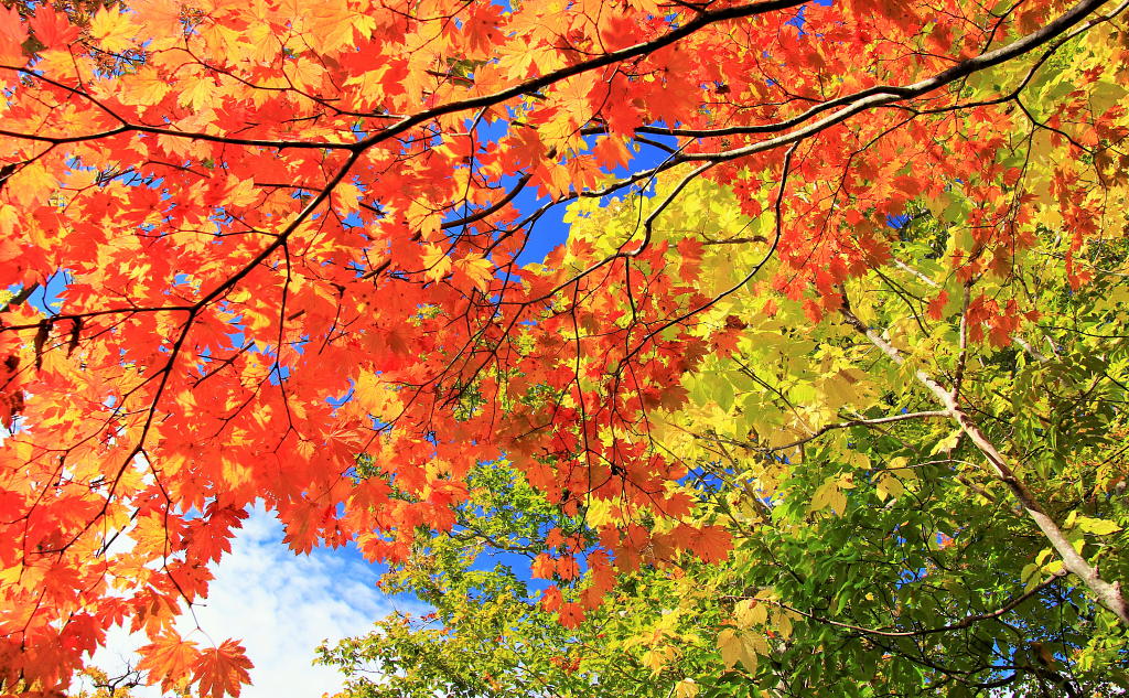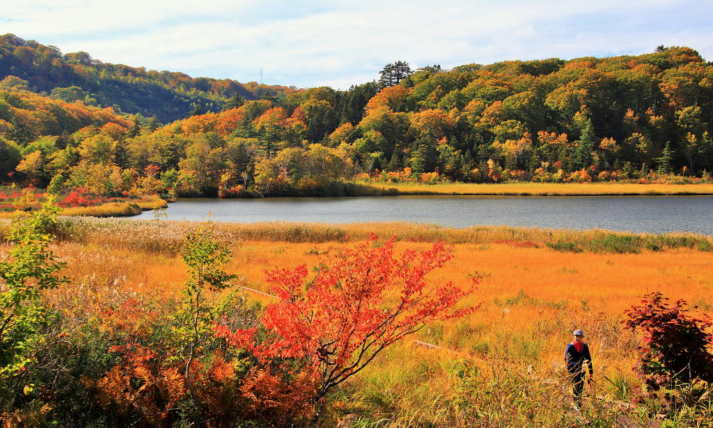 沼のまわりは、草モミジやハウチワカエデの赤色、コシアブラの黄色などが