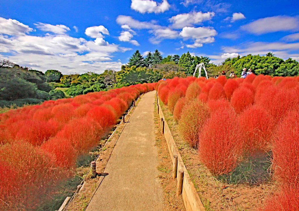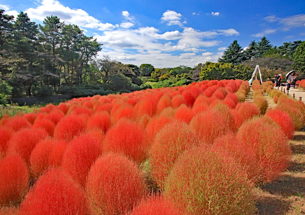昭和記念公園ハーブの丘のコキアがかなり赤く染まってきて、