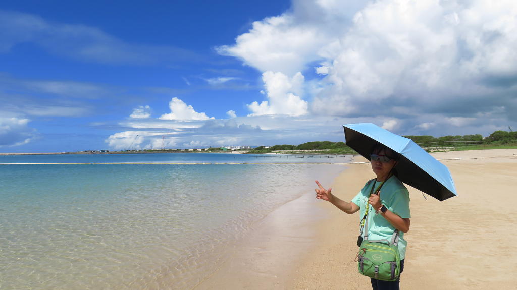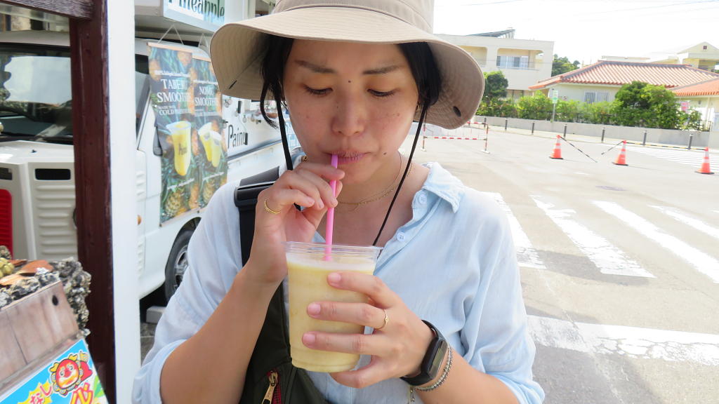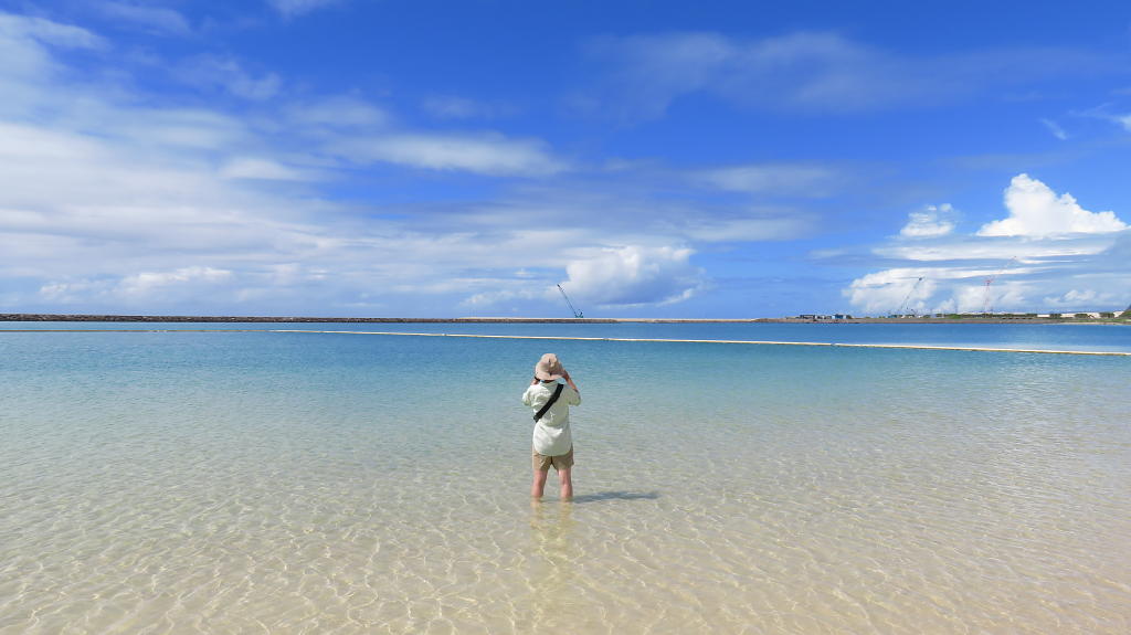 お買物を終えて、石垣市のビーチで静かな海を満喫します。