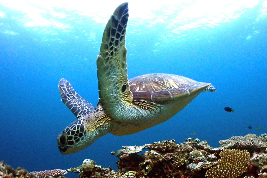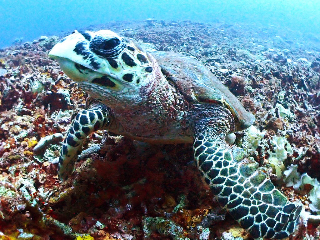 娘はスキューバダイビングで海に潜り、カメさんをナデナデしていました。